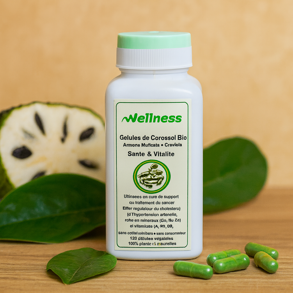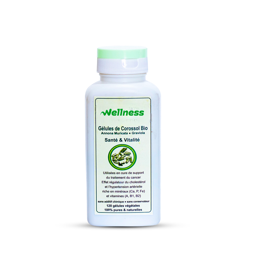 Description : Gélules Vegan 100% végétales et naturelles de poudre de feuilles de Corossol. Riche en minéraux (Ca, P, Fe) et vitamines (A, B1, B2). Sans additif, sans conservateur Indications : Effet apaisant et relaxant. Utilisées en cure de support du traitement médical du cancer. Effet régulateur du cholestérol et de l’hypertension artérielle; Utilisation : 6 gélules par jour en 2 ou 3 prises. Cure de 3 mois renouvelable. Déconseillée pendant la grossesse |